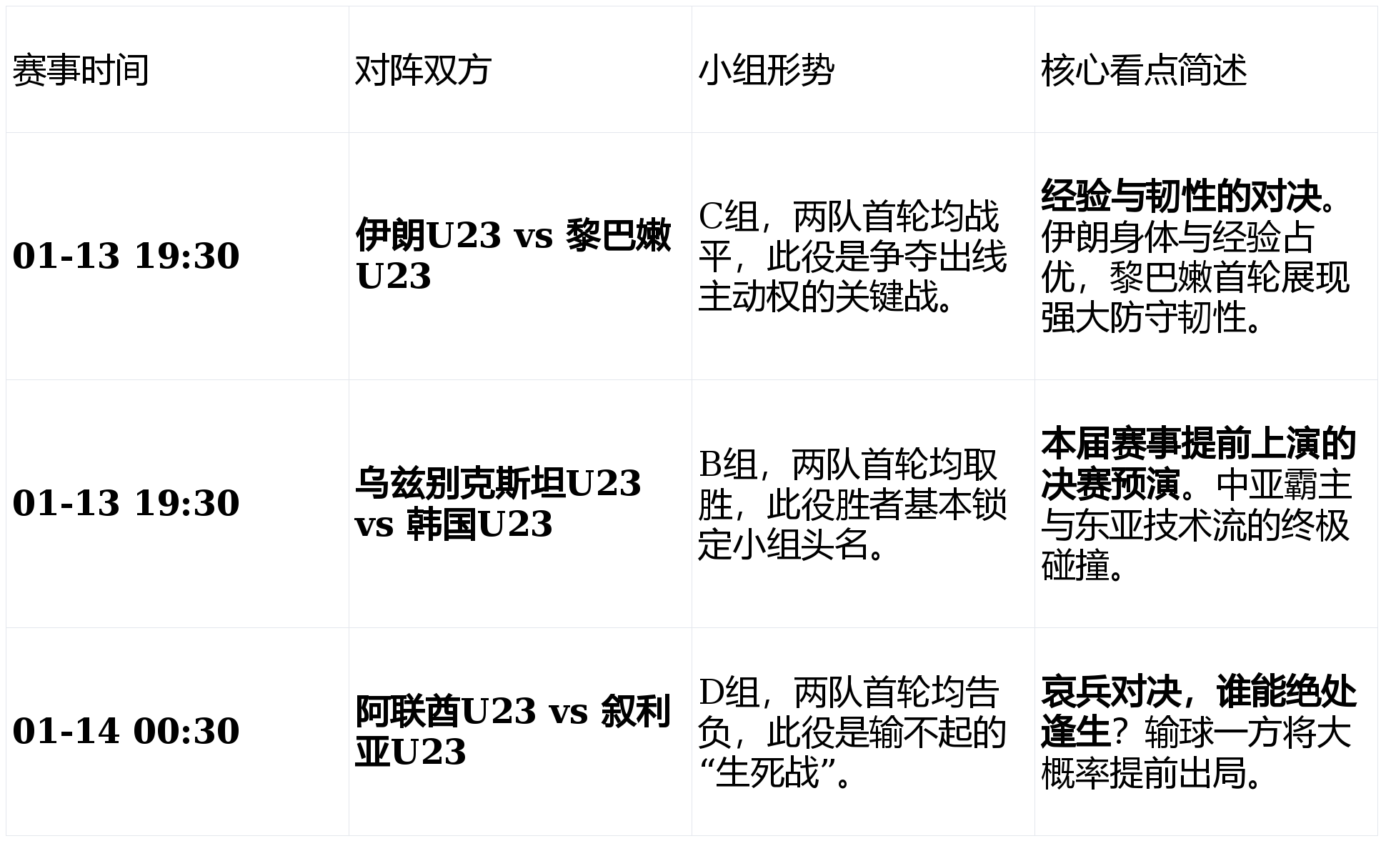 北京时间1月13日晚至14日凌晨,U23亚洲杯小组赛将展开多场对决。其中,C组的“西亚德比”伊朗对阵黎巴嫩,以及B组的“冠军级对话”乌兹别克斯坦迎战韩国,无疑是本轮焦点。而D组的阿联酋与叙利亚之战,则将深刻影响该组的出线形势。