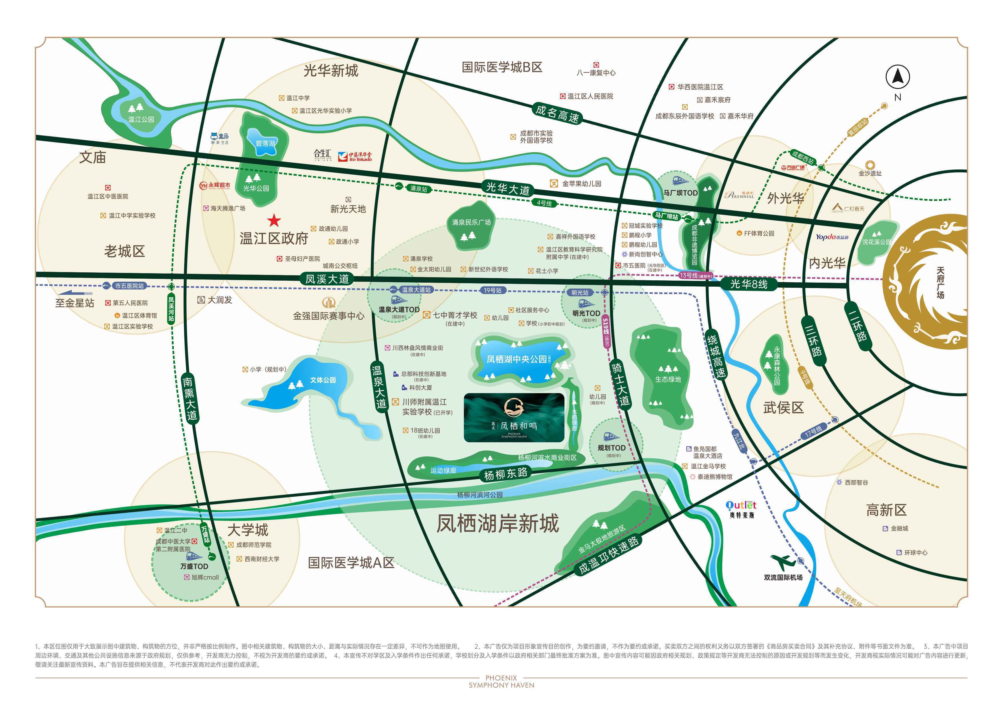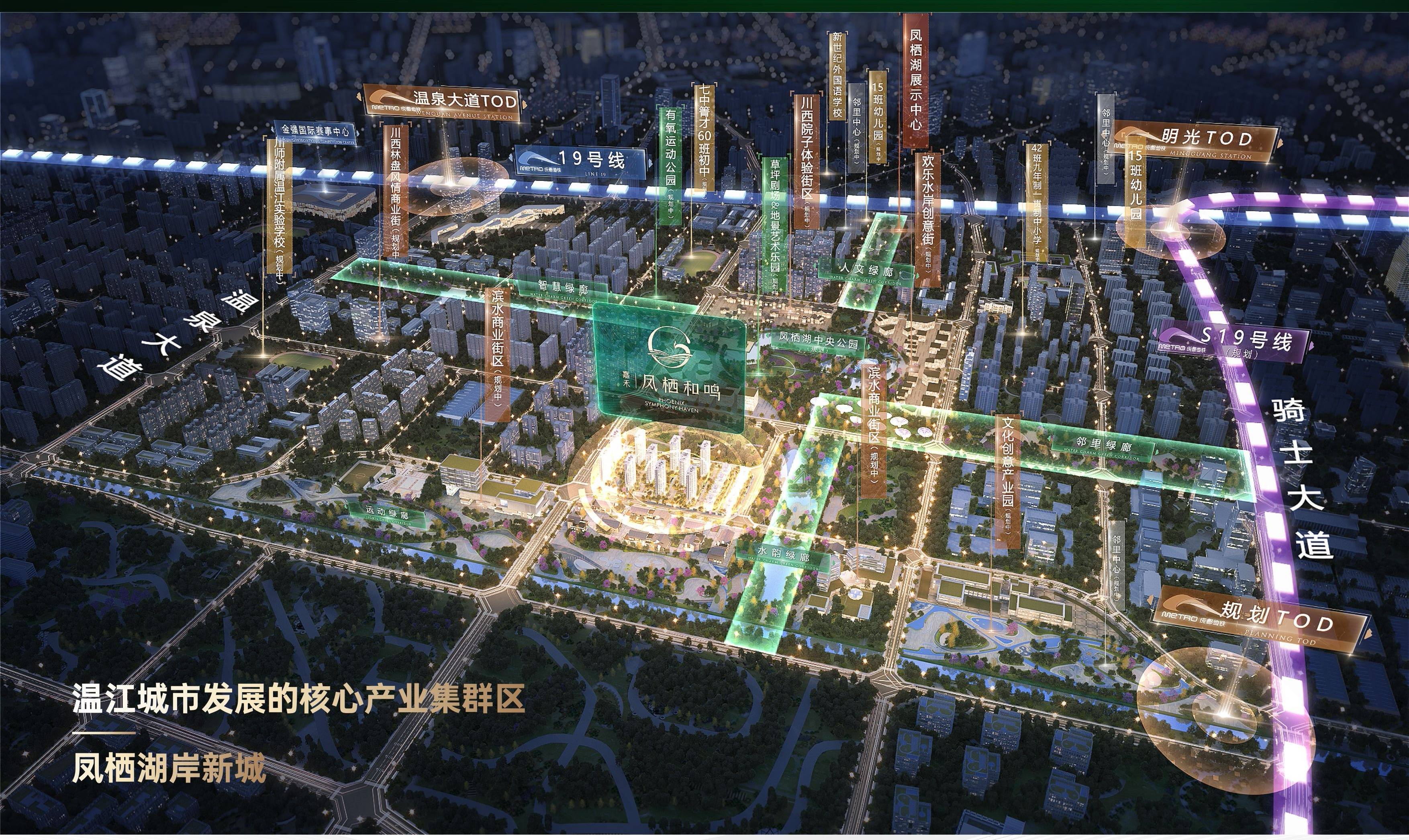 【嘉禾-凤栖和鸣】择址凤栖湖岸新城金贵版图芯核,南临凤榭一街,北临凤栖湖北路,傲占19号线双站点中间,是区域在售惟此高阶改善墅作。凤栖湖板块作为政府全力打造的“高质量创智产业新区、高品质环湖宜居新城”,着力打造生态优美、生活宜居、生产高效复合型城市样板,板块内温泉大道、明光站、规划站三大TOD赋能,约300亩凤栖湖中央公园、温江文体中心金强国际赛事中心、在建511亩国家级文体中心等集聚成势,共绘城市热力版图。