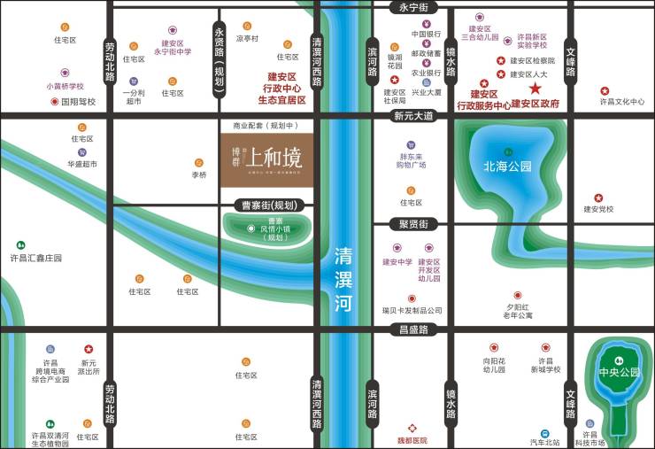 •【位置概况】距离建安区胖东来约700m,距离建安区政府约600m、距离北海公园约600m,距离清潩河公园约200m;